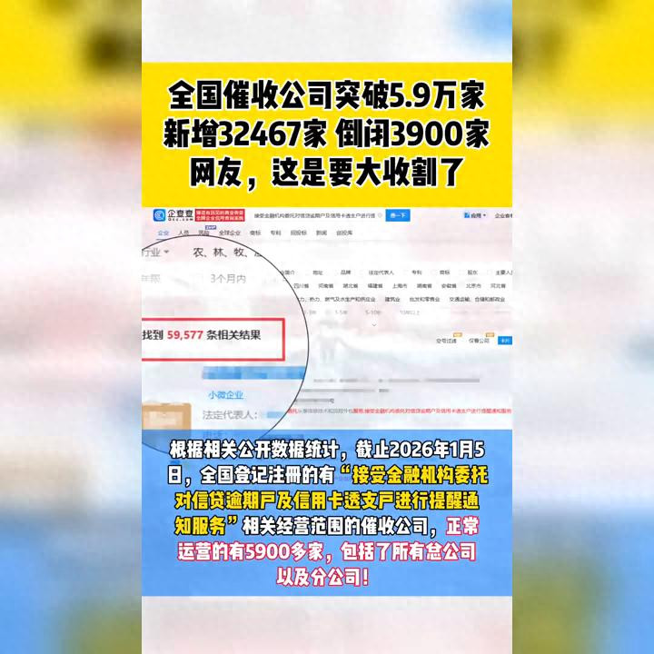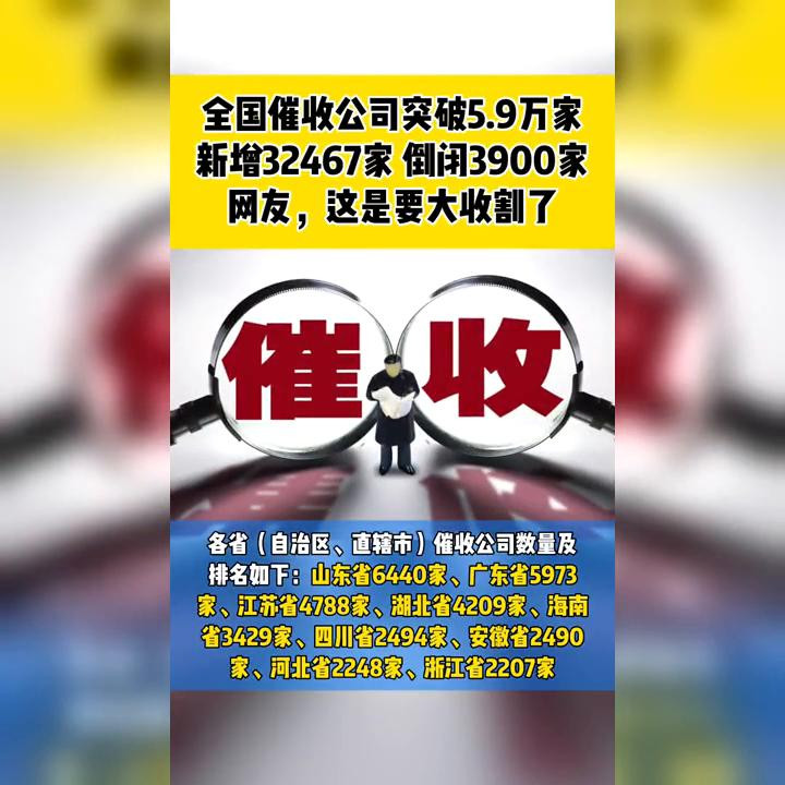 全国催收公司突破5.9万家,新增32467家倒闭3900家。网友,这是要大收割了。