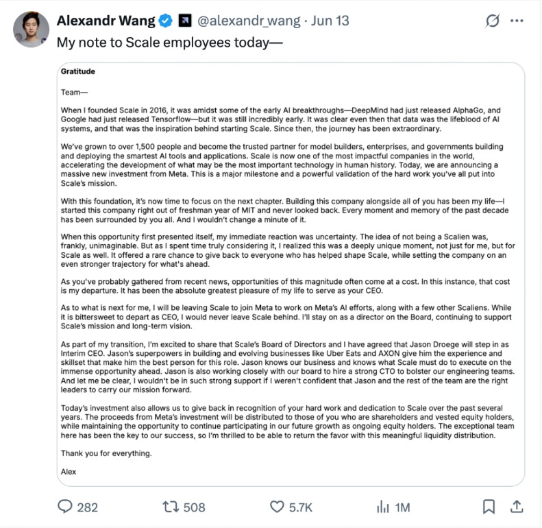 日前,年仅28岁的AI数据服务公司Scale AI创始人Alexandr Wang公开发布了一封全员信,宣布自己将卸任Scale AI的CEO并加盟Meta,执掌其最新成立的“超级智能实验室”。而就在几天以前,媒体消息称,Meta已同意以近150亿美元的天价收购Scale AI49%的股份。这不仅是Meta迄今为止最大的外部AI投资,也将成为史上最大规模的私营公司融资交易之一。